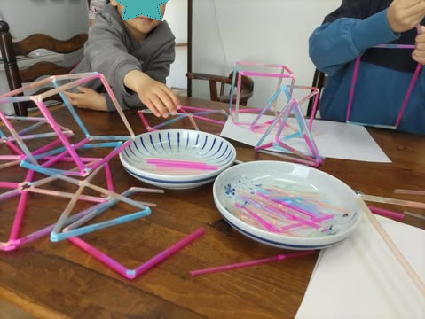 2月、3月はいすみ市のみんなの居場所みるるさんで計5人のお子さんたちとストロー工作で色々な形を作りました!最後、四角と三角で自由に作ってみようの時間に作っていたメガホンが、いつの間にか拳銃になっていたのはびっくりでした。(笑)